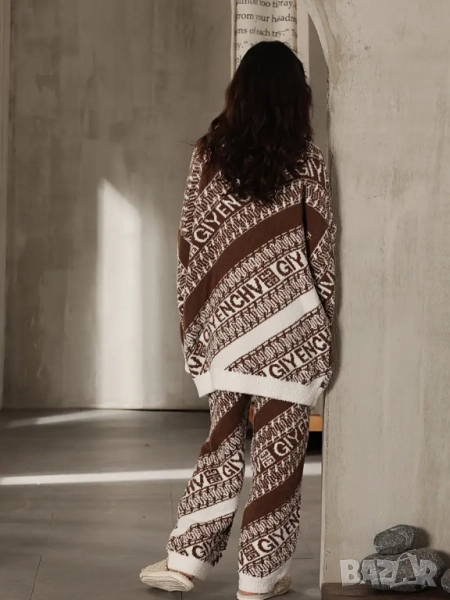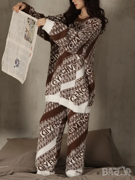 Нов без етикет полиестър висок косъм Дамски елегантен комплект с геометричен принт, дебел, свободен, дълъг ръкав, кръгло деколте, туника и панталон, удобна, свободна кройка за есен и зима.Има коланче което може да се сложи върху туниката или на панталона