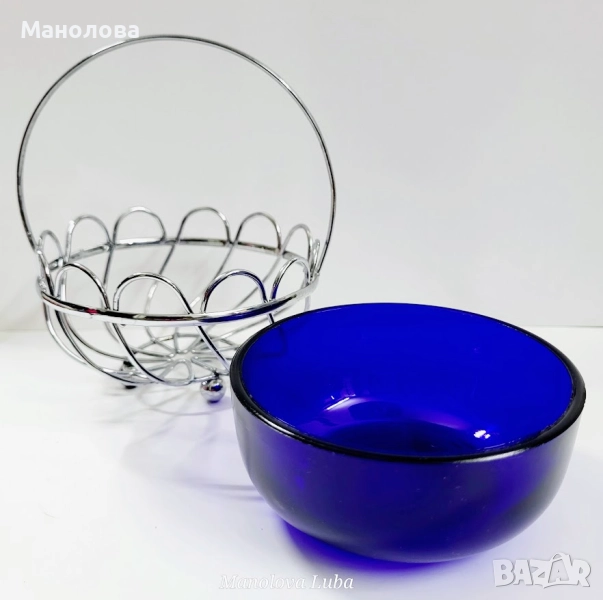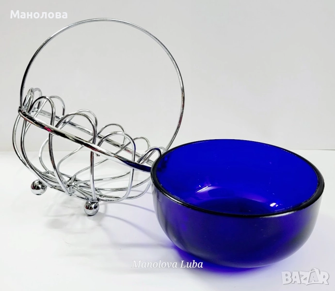 Винтидж купа за бонбони от синьо стъкло Bristol със посребрена поставка. Bristol Blue Glass е основана през 1988г. от Джеймс Адлингтън с помощта на производителя на стъкло Питър Сейнт Клер. Целта е да се възстанови традицията на производство на стъкло в Бристол, която е била загубена за повече от 60 години.