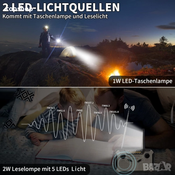 Спецификации: Честотен диапазон: FM: 87MHZ-108MHZ; AM: 520KHZ-1700KHZ WB: 162,400MHZ-162,550MHZ Мощност на слънчевия панел: 1.3W Източник на захранване: 4000mAh / 3.7V LED фенерче: 3W Лампа за четене: 3W AAA батерии: AAA 1.5V (не са включени)