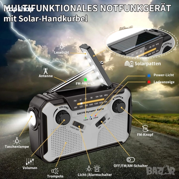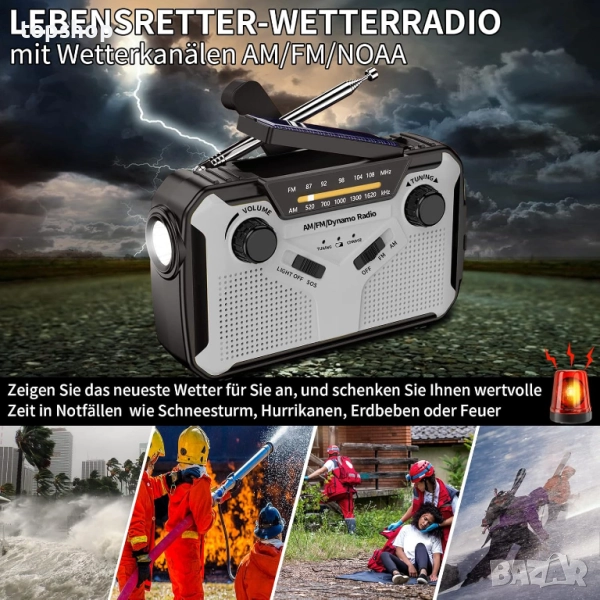 радио, преносимо AM/FM радио с манивела, динамо радио за спешни случаи с акумулаторна батерия 4000 mAh, LED фенерче, SOS аларма за къмпинг, на открито, спешни случаи (03)