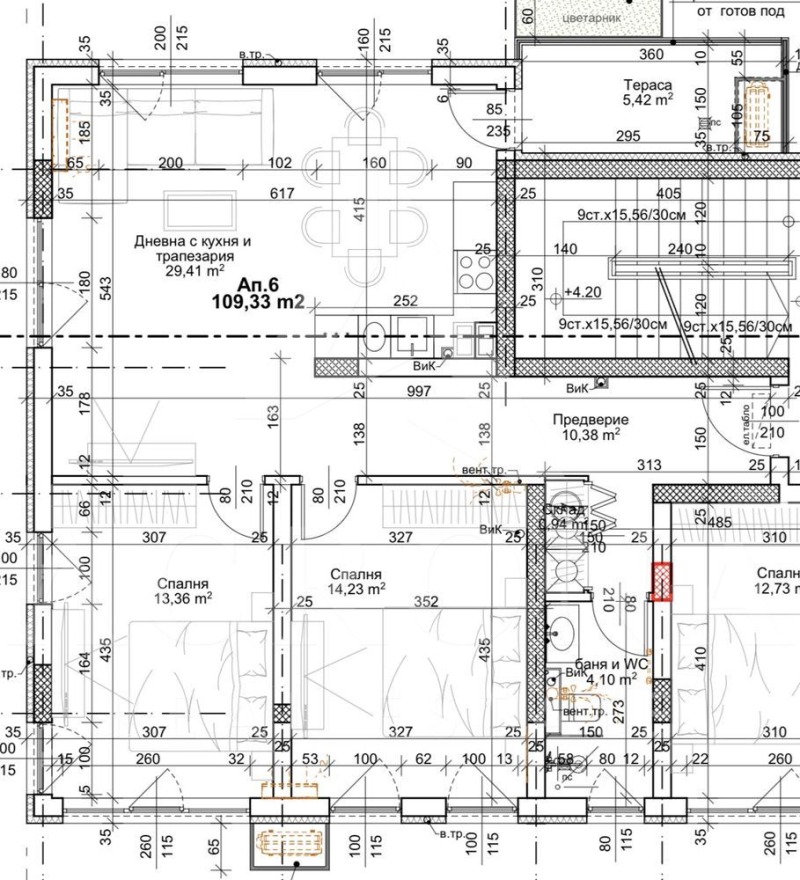 -Разпределение - всекидневна с кухненски бокс, две спални, баня с тоалетна, тераса, входно антре.