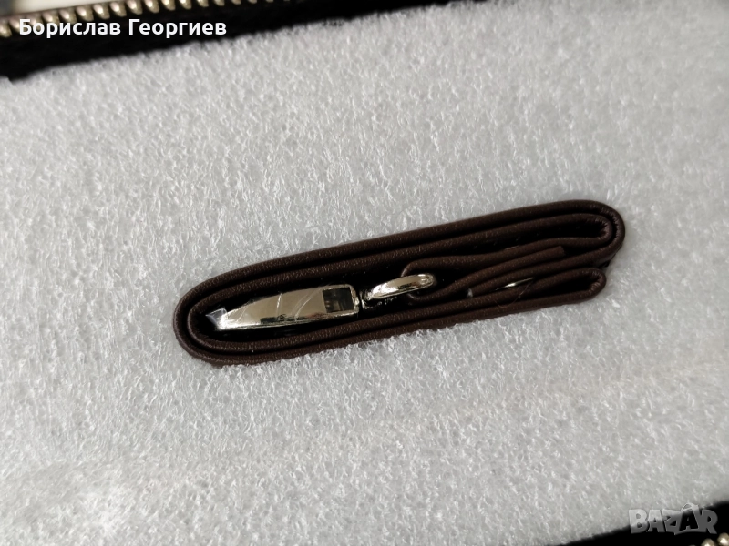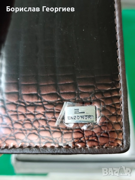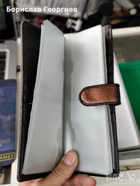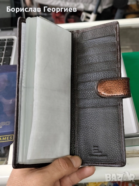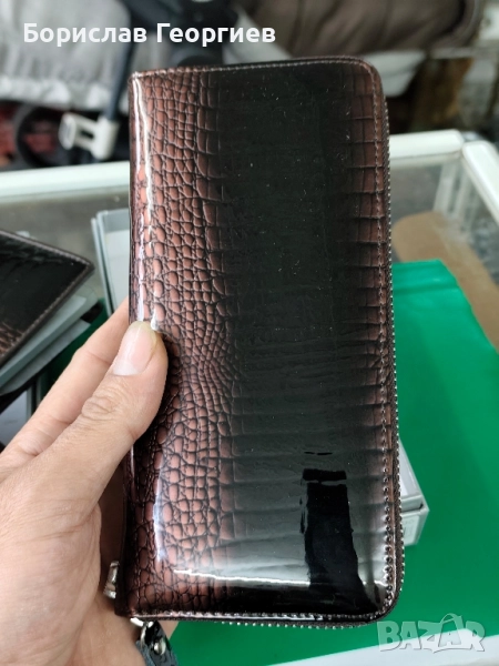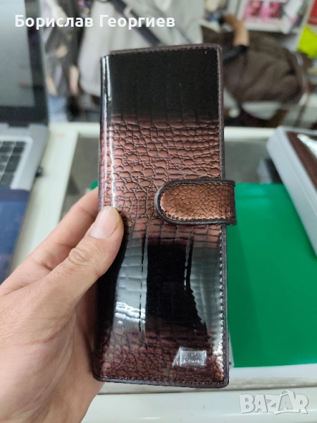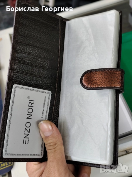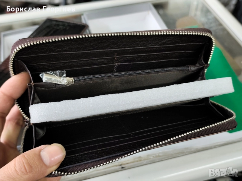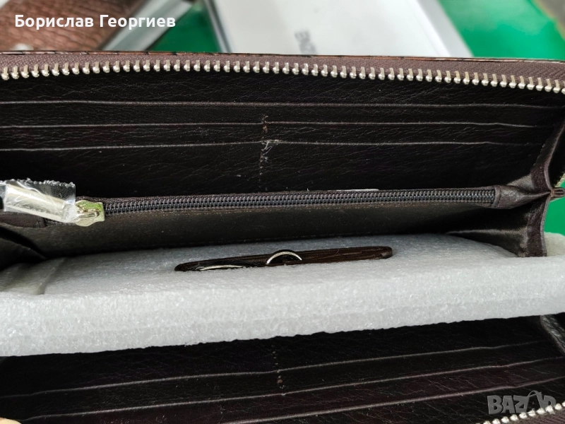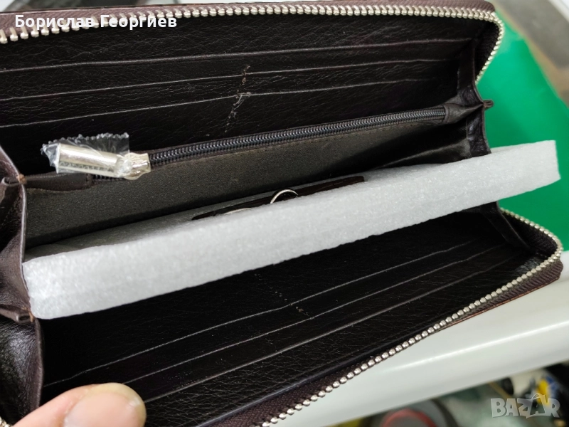 2. Размери 19,5 см х 9,5 см.8 отделения за карти,две отделения за банкноти и джоб с цип за стотинки.Закопчаване с цип.Има и каишка за ръка.