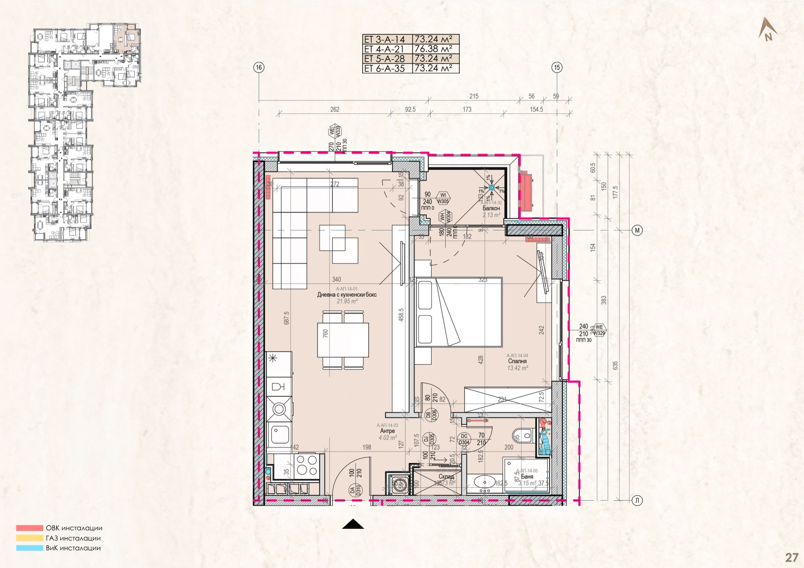 Апартамент A09 , обща площ 72,99кв.м. (нетна площ 58.28 кв.м. + общи части 14.71 кв.м.).