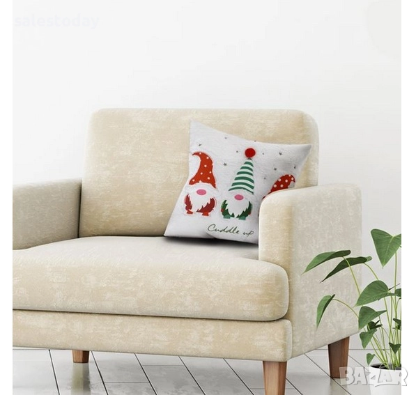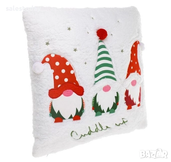 Коледна декоративна възглавница за диван, бяла, фигури на Дядо Коледа, джудже, 40x40см