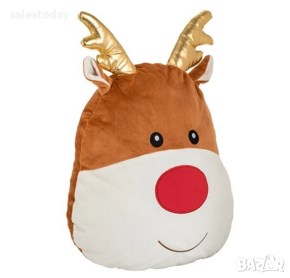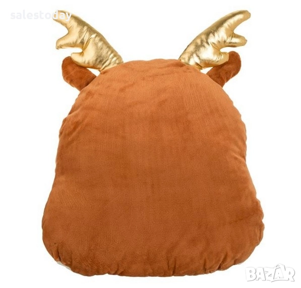 Коледна декоративна възглавница, еленска глава в кафяв цвят, с червен нос, ушички и златни рогца, едностранна без цип.