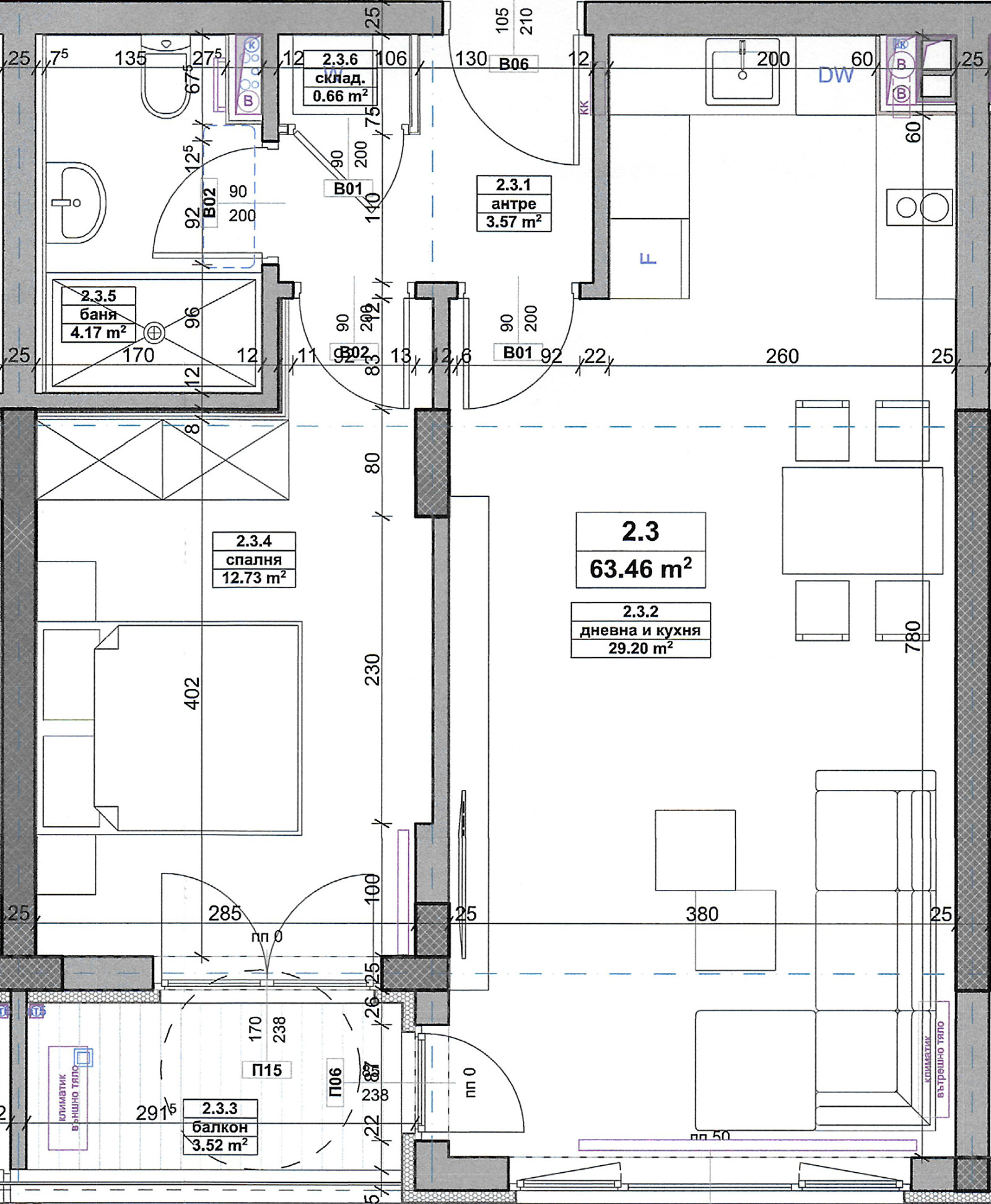 Площ: обща 75,56 м² | чиста 63,46 м² | общи части 9,82 м² | склад 2,28 м²