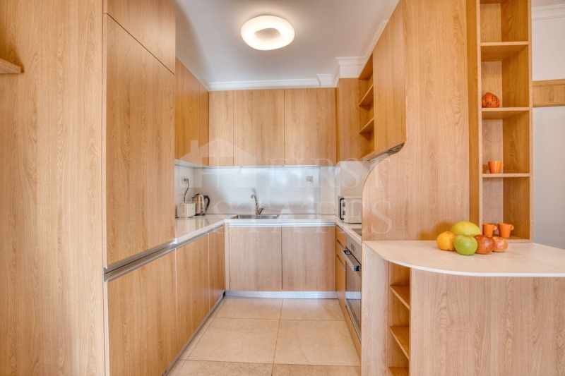 В антрето има вграден дълбок гардероб. В дневната се помещават трапезарията и кухненския бокс. Кухнята е снабдена с висок клас електроуреди. Голямата тераса към дневната открива живописна гледка.