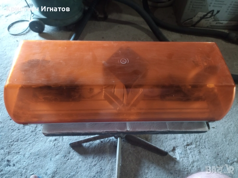 От снимка 1 до снимка 3 включително е авариен буркан с две въртящи се светлини в него и между тях ориганално е поставена огледална ламарина от нераждаема стомана която има ромбовоидна форма за по-добър ефект на видимост по време на работа и създава илюзията , че е с 4 и повече въртящи светлини . Всичко се вижда на снимките му . Той е на 24волта с две халогени крушки модел H1 . Вижда се как свети и при много слънчево и ослепително време когато се пусне да работи !!! Буркана е НЕМСКИ !!! Цената му е 56,3 евро или 110 бг.лева !!! Размерите му са - Висичина 137мм. Ширина от долната му страна основата му е 205мм. Дължина от долната му страна основата му е 565мм . Ширина от горната му страна е 150мм. Дължината от горната му страна е 500мм .