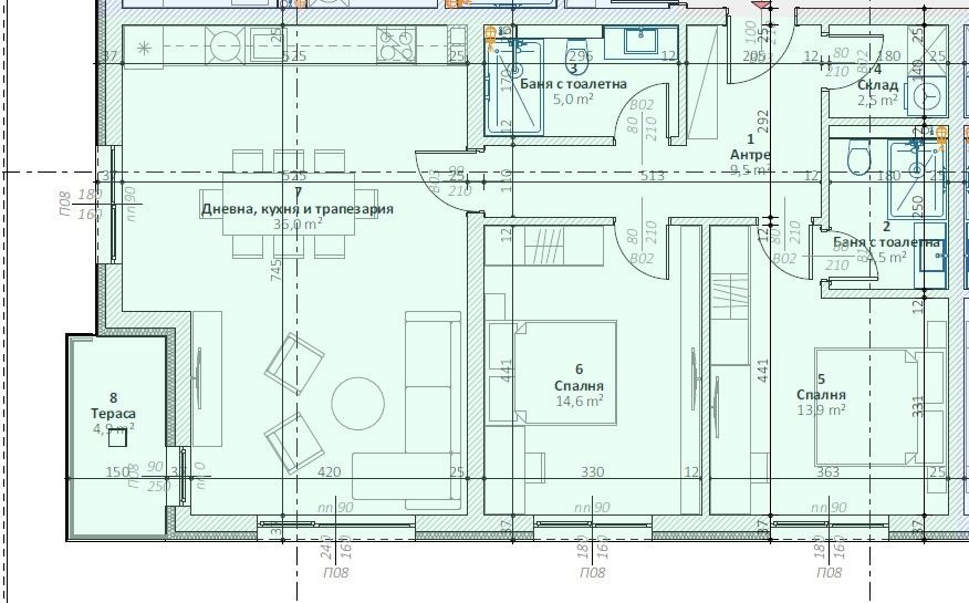 Тристайният апартамент е ситуиран на 3-ти жилищен етаж и разполага с площ от 120 кв.м., разгърната в следното практично разпределение: Коридор, дневна с кухненски бокс, две спални, две бани с тоалетни, склад, тераса.