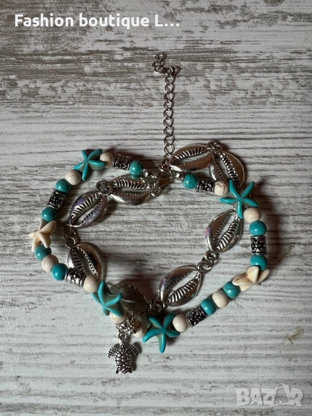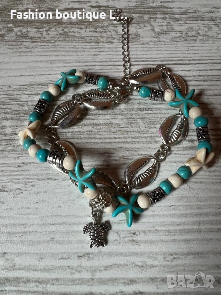 Двойна гривна за крак или ръка с сребърни мидички и тюркоазени камъчета с висулка костенурка 💚🩵💙 → Обява 52376522