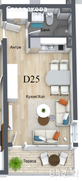 Директно от инвеститора. Едностаен апартамент D25 (блок D, ет 2) с площ 47,52 кв.м., с разпределение: антре, хол с кухня, баня с тоалетна, тераса. Цена: €45550 без ДДС.