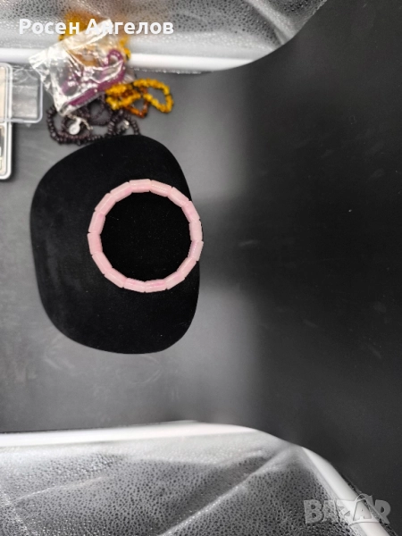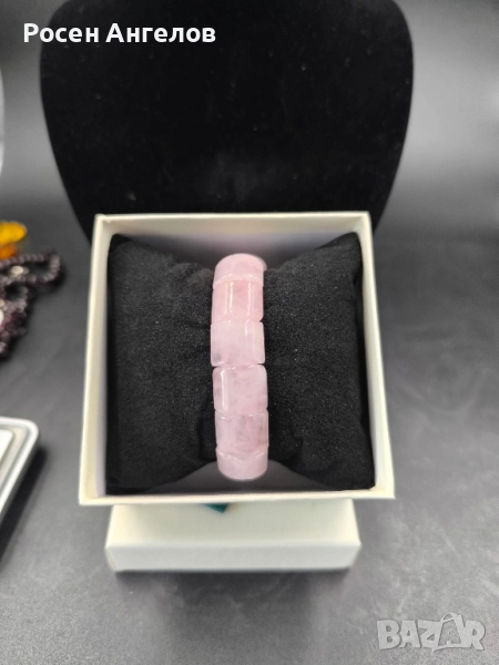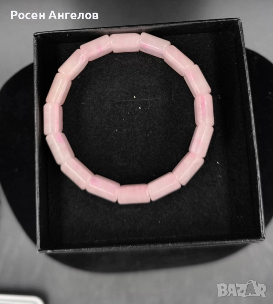 Изящна гривна, изработена от плоски естествени камъни розов кварц, с гладка полирана повърхност и нежен розово-пастелен блясък. Всеки камък е уникален, с деликатни нюанси и естествени шарки, които придават усещане за хармония и женственост.