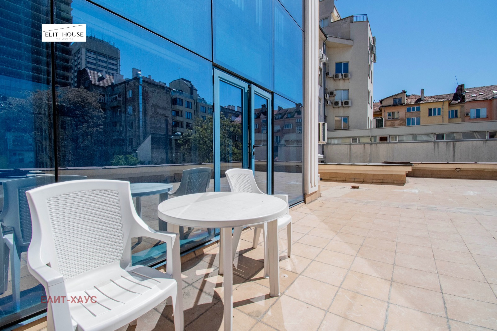 Елит Хаус представя обзаведен луксозен офис в красива представителна офис сграда с красива тераса 100кв.м., офисът представлява: малка кухня, две работни помещения, баня с тоалетна, и излаз на голямата тераса, напълно окабелен, с охранителна система, в отлично състояние;