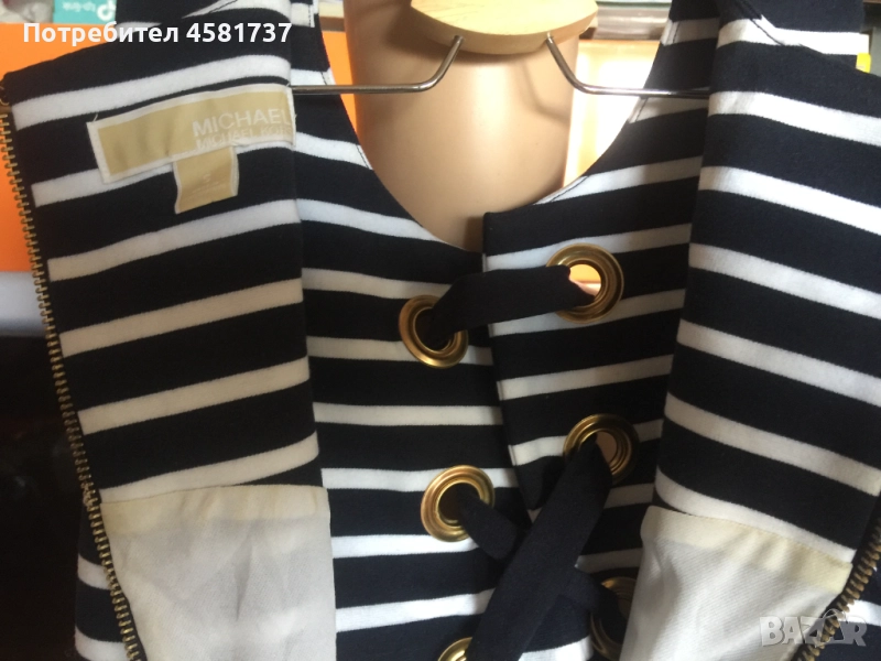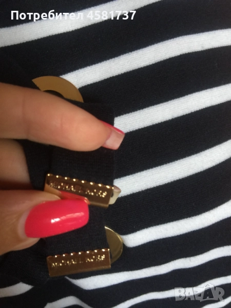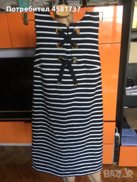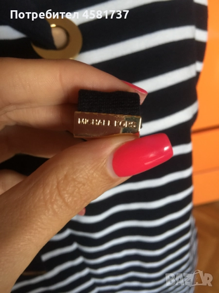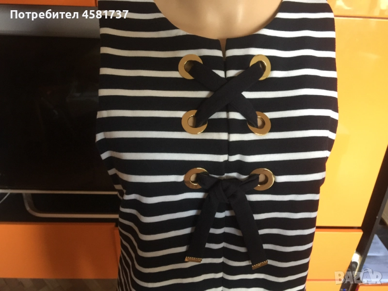 Тази рокля на скъпия бранд Michael Kors е издържана в класически летен десен, с най- емблематичната морска яхтена комбинация от тъмно- синьо и бяло хоризонтално, едро райе. Класиката е допълнена с оригинални и запомнящи се детайли, които подсилват морското излъчване- в едри, триредни халки е нанизана тъмносиня лента, която се завръзва като морски възел в долната си част. Връзките завършват със златиста плочка, на която е изписано името на бранда.Роклята се закопчава отзад с масивен, златист цип, брандиран,който хармонира със златистите халки в предната част на роклята. Кройката на роклята стои леко свободно, но подчертава по превъзходен начин женските извивки. Комбинира се успешно със сандал тип платформа в тъмно- синьо и бяло или само тъмно-синьо. Така яхтения стил би бил напълно завършен.