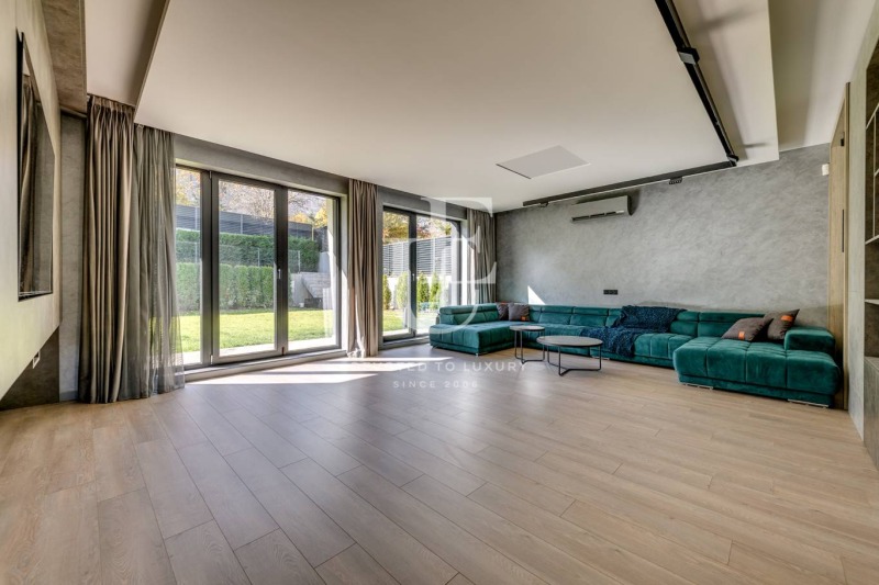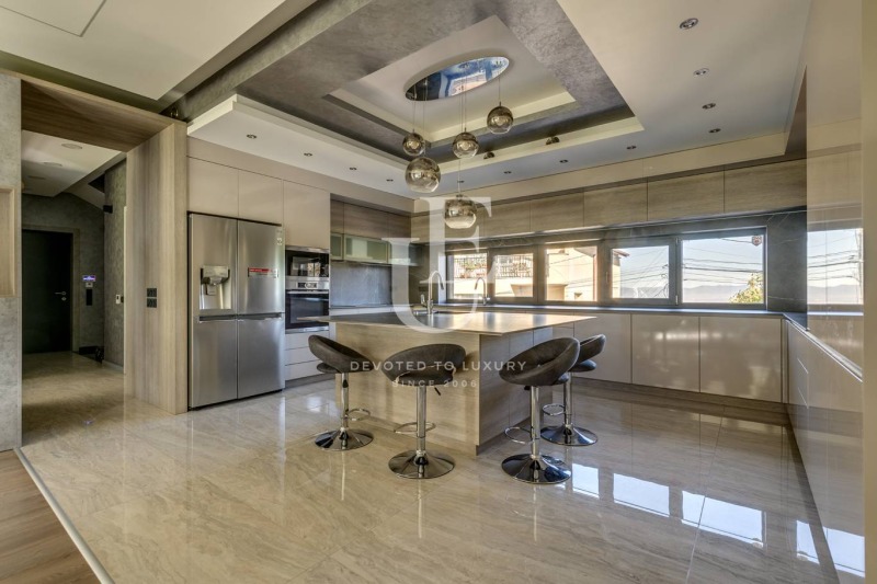 Дневна зона с високи тавани, панорамни френски прозорци и директен излаз към озеленения двор, кухня с остров, оборудвана с техника от най-висок клас, трапезария с достъп до покрита веранда с кът за отдих и хранене на открито