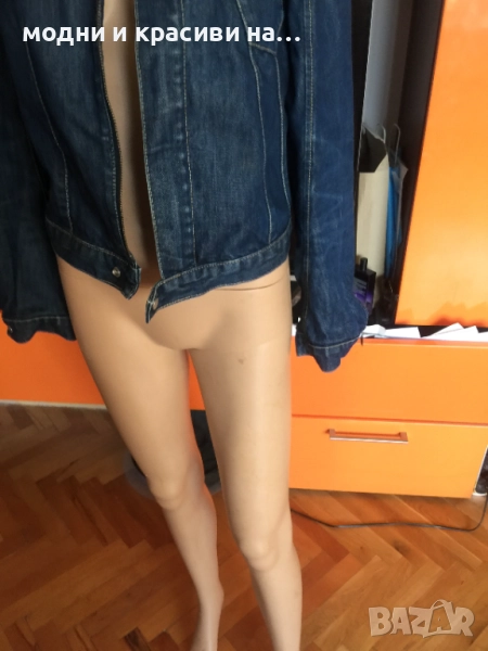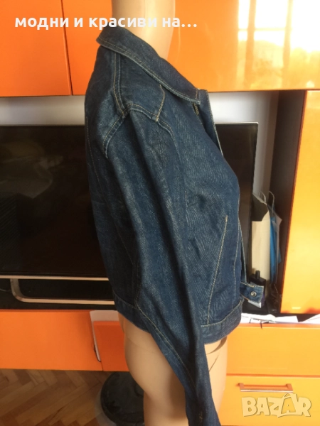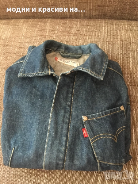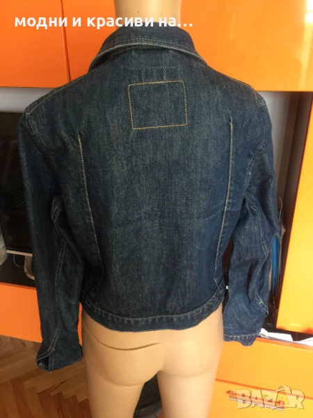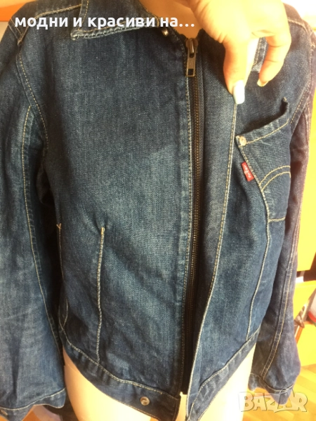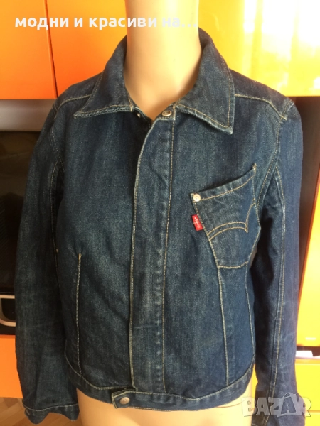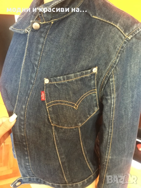 Това яке е от т.нар basic дрехи, които са нужни за всеки дамски гардероб. Деним материя, съчетаема с всичко. Доказал се бранд в производството на артикули от деним Levi's®. Моделът е къс и втален. Стои прекрасно с рокля- макси или мини. Вталеният и скъсен модел подчертава талията. Закопчване с цип, две копчета в долната и горанат част-брандирани. Един преден джоб, два вътрешни странични. Класически модел. Тъмен деним,
