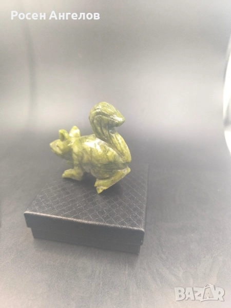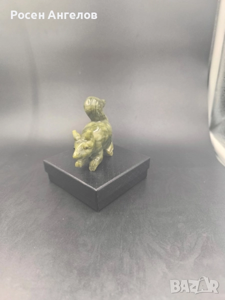С размери 9×7×5 см, тя е компактна, но впечатляваща, подходяща както за колекционери, така и като декоративен елемент във вашия дом или офис. Нефритът е символ на хармония, баланс и положителна енергия, а тази фигурка съчетава естествената красота на камъка с майсторско изпълнение.