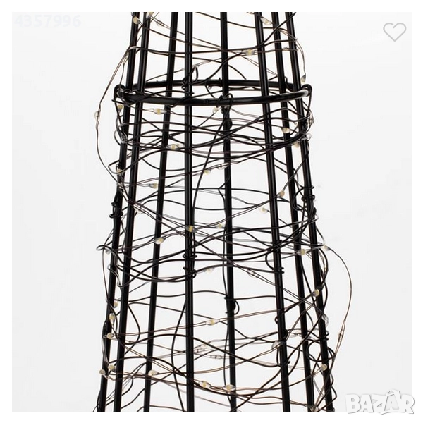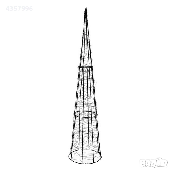 Декоративна коледна елха с черна метална рамка, осветена с шишарка. Разполага с 300 сплетени LED крушки с топла бяла светлина и 8 функции.