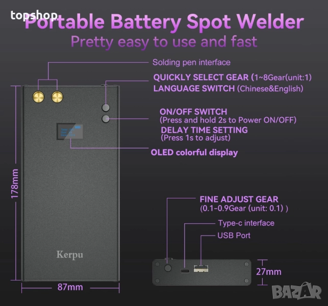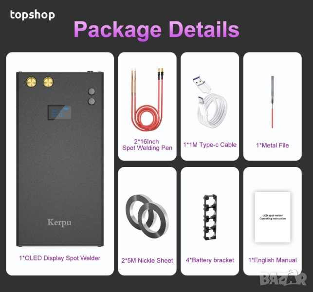 Апарат за точково заваряване Kerpu с батерии. Осъществява връзка между батериите. Непрекъсната и стабилна. LCD екранът ви позволява да виждате параметрите по-визуално и удобно. Вградена акумулаторна батерия 11000Mah. Оборудван е с писалка за точково заваряване и никелово фолио, за да гарантира, че вашите смарт устройства получават огромна енергийна мощност и ще ги съживят.