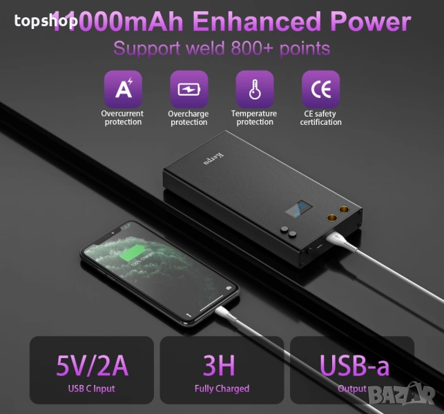 Обърнете внимание на детайлите при употреба и безопасността: Много точкови заваръчни апарати се нуждаят от допълнителна мощност. Точковият заваръчен апарат има вградена батерия от 11000 mAh, така че можете да го използвате навсякъде. Заваръчният апарат тежи 540 грама и е изработен от метал, който не се разклаща лесно при употреба. Вградени множество защити за безопасност на вас и вашето оборудване.
