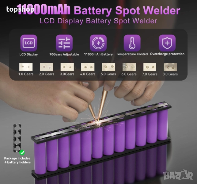 Ниво на мощност 70Weld: Фин дизайн, прави точковото заваряване още по-впечатляващо. Ако често се нуждаете от батерии за вашия проект на верига, това е много добър заваръчен апарат. Има 2 функционални бутона за предавки, Бутон Gear1: Позволява ви бързо да изберете предавката (1-8 предавки) за фиксирано заваряване, Бутон Gear2: Позволява ви фино да регулирате размера на предавката (0,1-0,9) за допълнително заваряване.