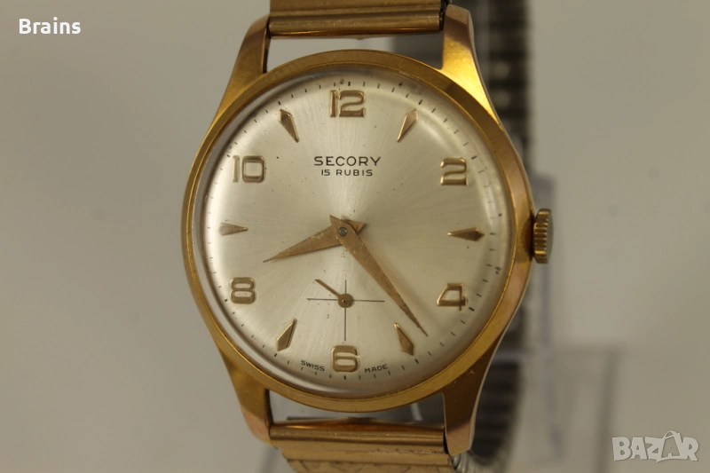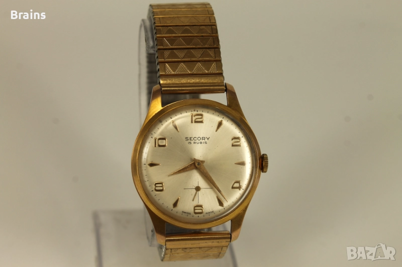 Колекционерски Швейцарски ръчен позлатен часовник SECORY от 1960-те години.Швейцарска машина със 17 камъка. Отлично работещ. 10 Микрона позлатена каса в отлично състояние без заносвания. Стара позлатена разтегателна Швейцарска верижка.