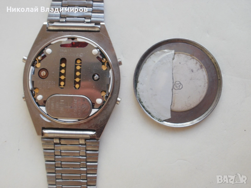 Часовника е в отлично състояние и е доста рядък.Батерията е специална и няма такива вече но със свързани две батерии последователно часовника работи.