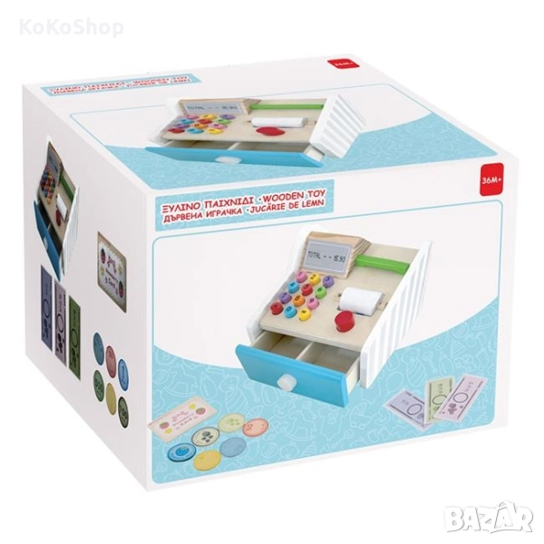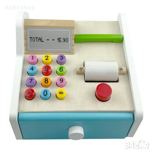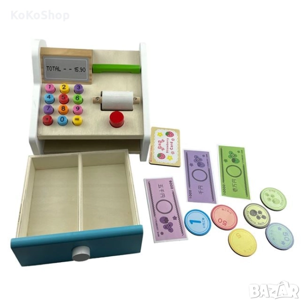 Реалистичен дървен касов апарат с цветни бутони, ролка хартия, карта, банкноти и монети. Има ръчно отварящо се чекмедже