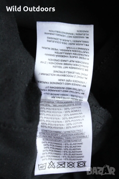 Два вида материя - 65% полиестер и 35% памук - здрава, комбинирана с полиамид и еластан на натоварените зони за комфорт при движение, приклякане.