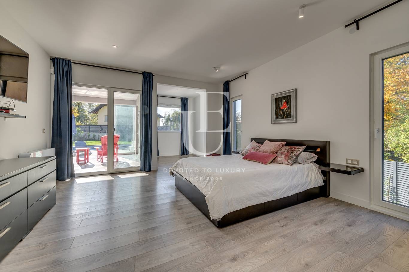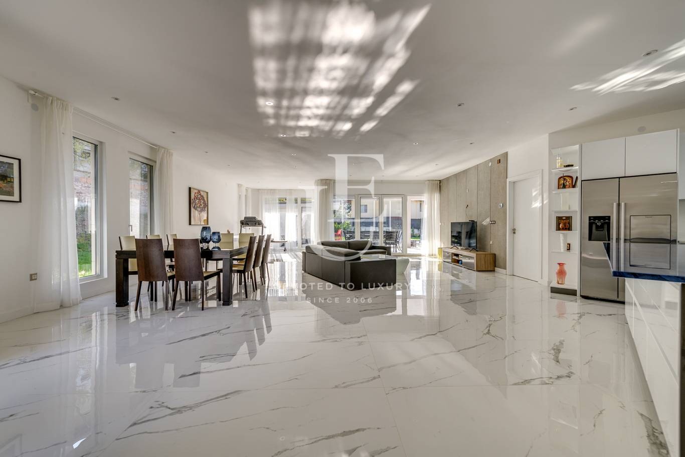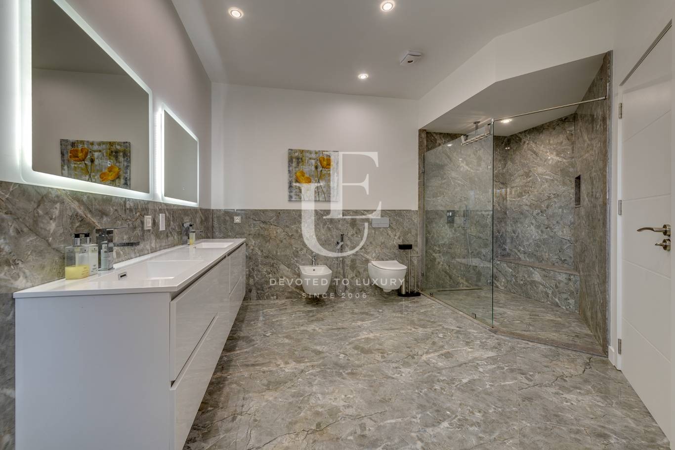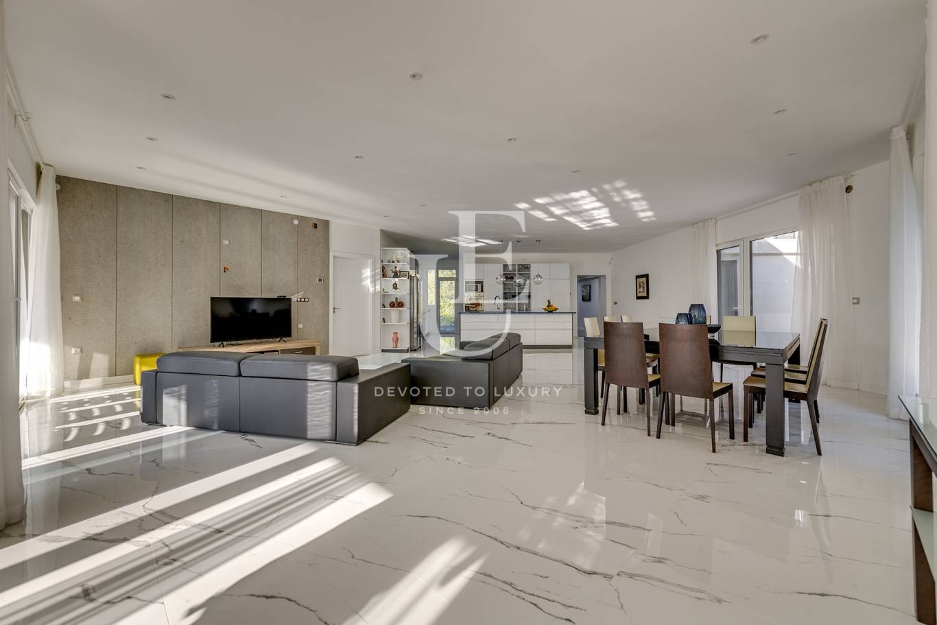 Първи етаж: просторна и светла дневна с трапезария и кухня, зимна градина с гледка към двора и басейна, тоалетна, родителска спалня с дрешник, самостоятелна голяма баня, втора голяма спалня със самостоятелна баня и излаз на просторна тераса, мокро помещение