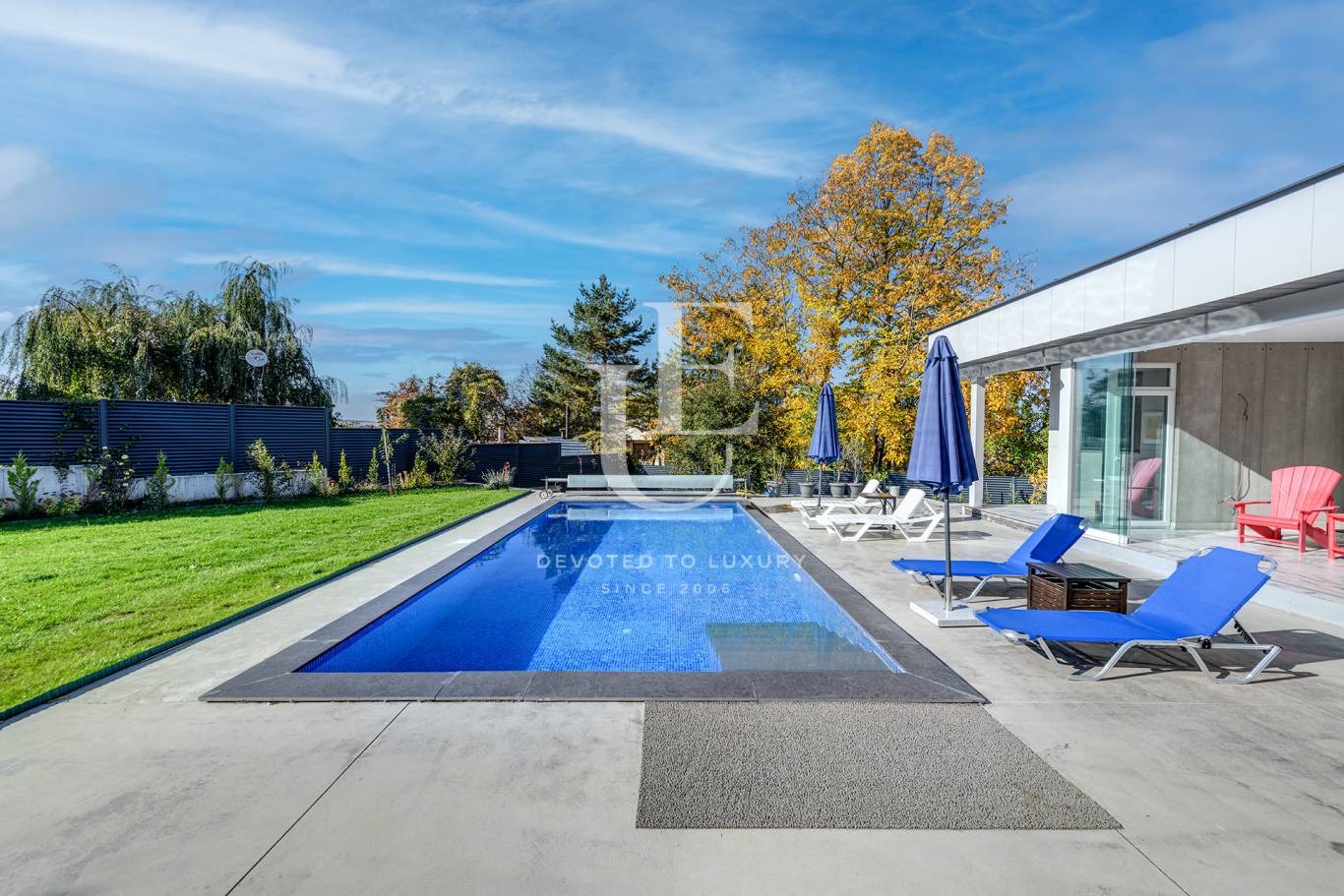 Парцелът на къщата е 1456 кв.м., перфектно аранжиран и озеленен, с отопляем външен басейн и барбекю с лятна кухня.