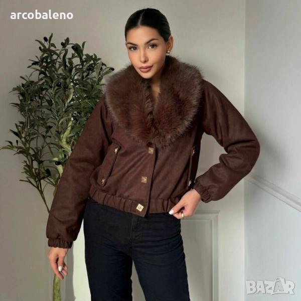 Късо яке, подчертано от голяма яка от изкуствена кожа в съответстващи тонове. Структурираната му кройка и златисти завършеци му придават елегантен и изтънчен вид.
