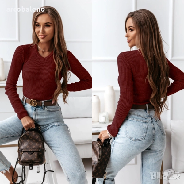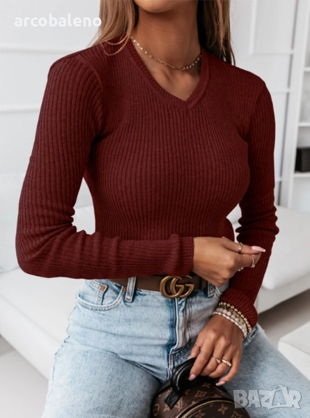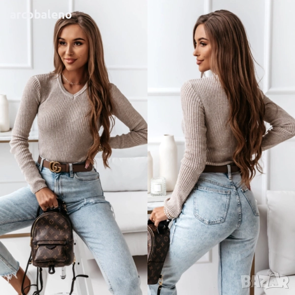 Вталният дамски пуловер е класика, която никога не излиза от мода. Можете да го намерите и в други приглушени есенни цветове.