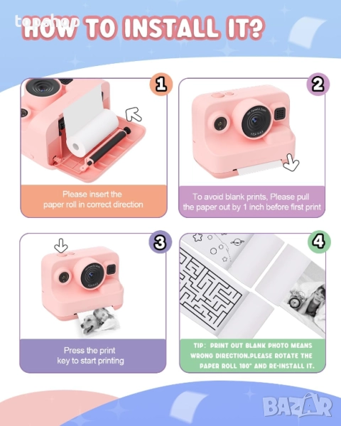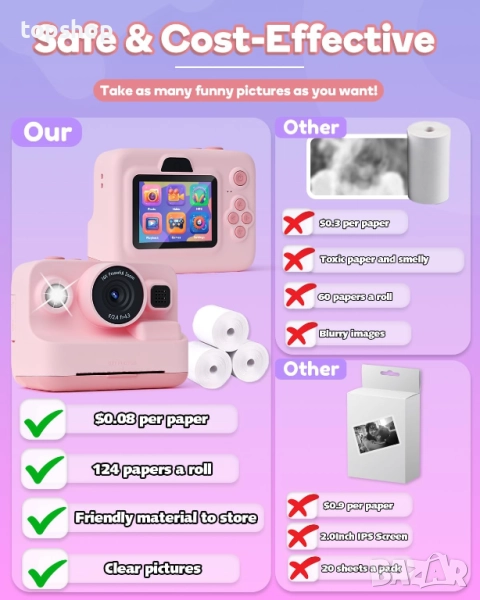 Безопасно и надеждно: Детската камера за моментално снимане е отпечатана с усъвършенствана технология за термопечат, хартията за печат не съдържа BPA, което е по-безопасно и гарантирано. Висококачественият мек пластмасов удароустойчив корпус осигурява ефективна защита срещу падания. Безопасните и надеждни играчки са най-подходящите подаръци за деца.