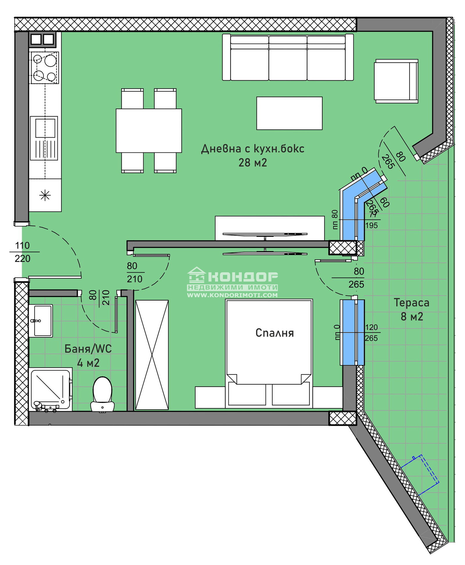 Оферта 67942 - Предлагаме Ви възможността да си закупите двустайно жилище в новоизграждаща се модерна сграда, разположена на тихо и спокойно място в квартал Смирненски, в близост до голям зелен парк, детска градина и елитни училища, като района е един от най- предпочитаните за живеене. Сградата е проектирана с коренно различна концепция за визия и стил, с цел да създаде максимален комфорт и съчетаваща високо качество на изпълнение. Апартаментът се състои от дневна - 25 кв.м. с излаз на страхотна тераса, трапезария и кухненски бокс, една самостоятелна спалня и баня с тоалетна. Изпълнението се осъществява с висококачествени материали и съвременни технологии по европейски стандарт висок клас Алуминиева дограма с прекъснат термо мост и троен стъклопакет - Четири сезона, Фасада изпълнена с изолация от