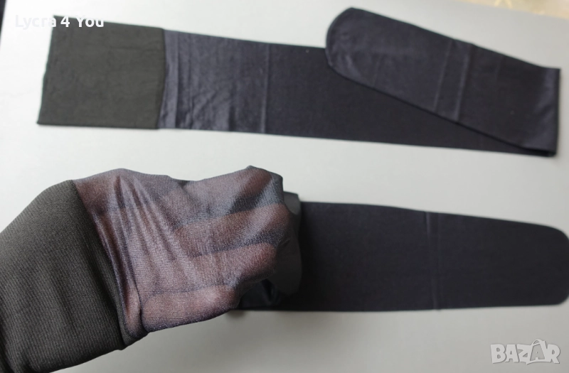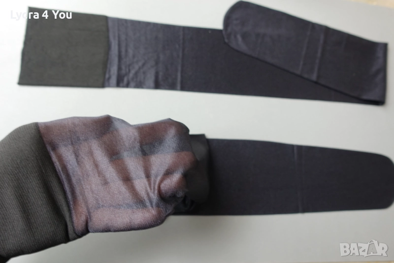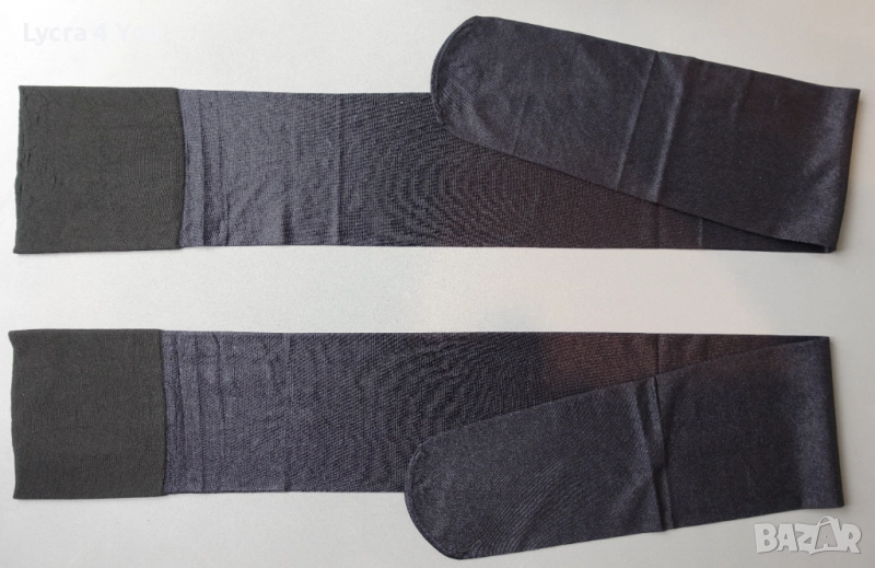 Нови в опаковка, черни и много лъскави чорапи с ликра и широка плоска памучна лента на бедрата за жартиери, но могат да стоят на краката и без жартиер. Плътност: около 40 den.