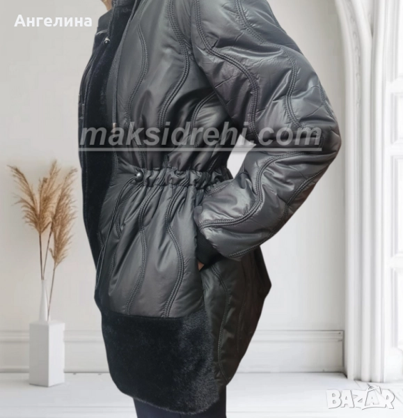 Палтото е с **неподвижна качулка**, снабдена с **връзка за регулиране**, и **висока яка**, която осигурява отлична защита от студ и вятър. Закопчава се **с цип до горе**, а **ръкавите са с плетени ластици**, които задържат топлината и придават комфорт при носене.