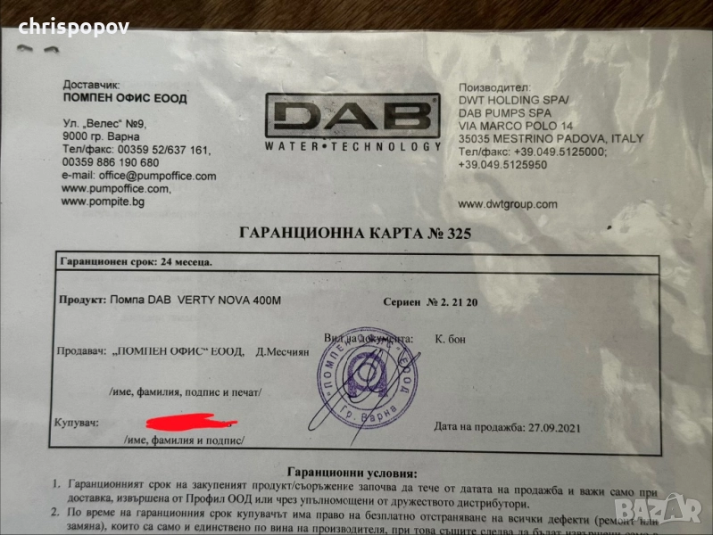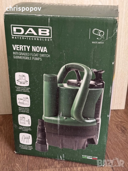 Продавам помпа DAB VERTY NOVA 400 M. Чисто нова, неизползвана - беше купена за всеки случай, но така и не влезе в употреба. Закупена от Помпен офис Варна, гаранцията е изтекла вече, но прилагам всички документи.