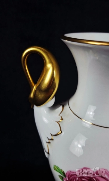 Впечатляваща ваза с елегантна силуетна форма и двустранна декорация с роза. Дръжките са оформени като стилизирани лебеди, покрити с позлата, което придава аристократичен и класически завършек.