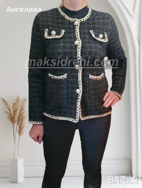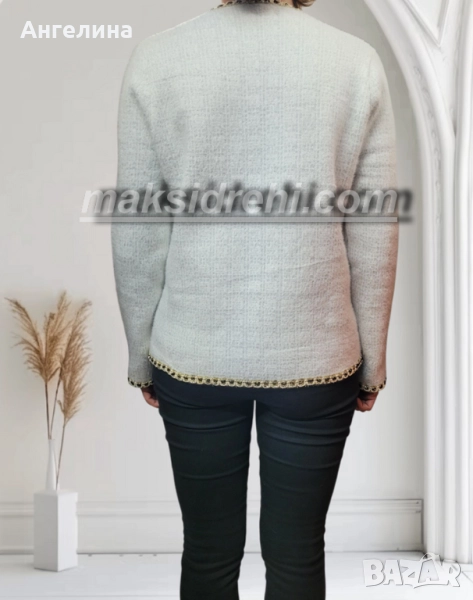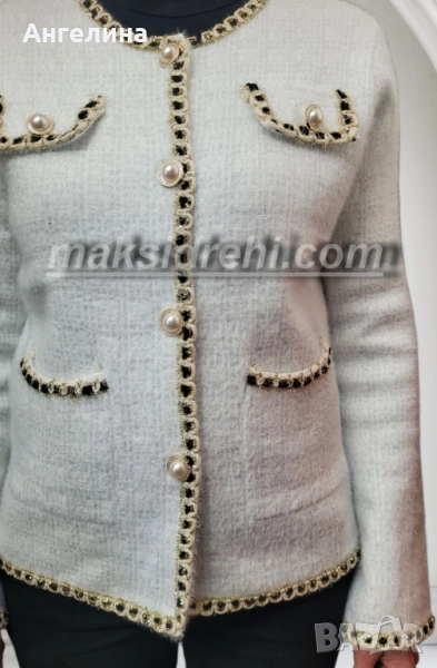 Елегантна **дамска жилетка тип сако**, изработена от **изключително мека и пухкава материя** с фина **ламена нишка**, която придава лек блясък и луксозно излъчване. Моделът е **вдъхновен от класическите жакети в стил “Шанел”**, съчетавайки елегантност и комфорт.