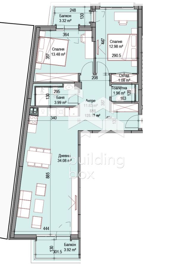 Имотът е с много добро разпределение, със застроена площ от 113кв.м. Състои се от дневна с кухненски бокс, 2 спални, баня с тоалетна, една самостоятелна тоалетна, две тераси, склад и коридор. Изложението на апартамента е север-юг. Сградата е предвидена да се отоплява на ТЕЦ и климатици.