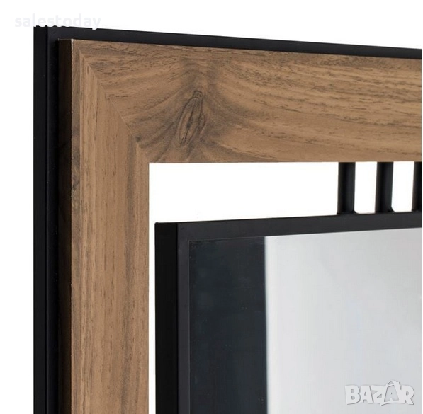 Декоративно стенно огледало с дървена рамка с кафяви шарки, метална рамка и възможност за вертикално монтиране.