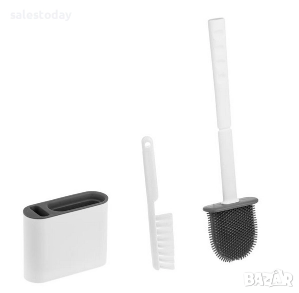 Комплект за почистване на тоалетна, бяла поставка за стена, четка- мека глава+ сива силиконова четка