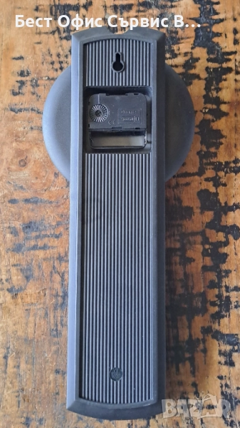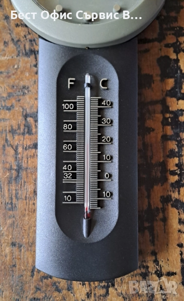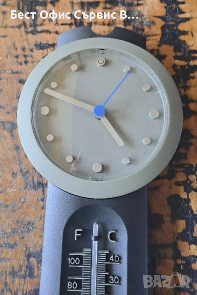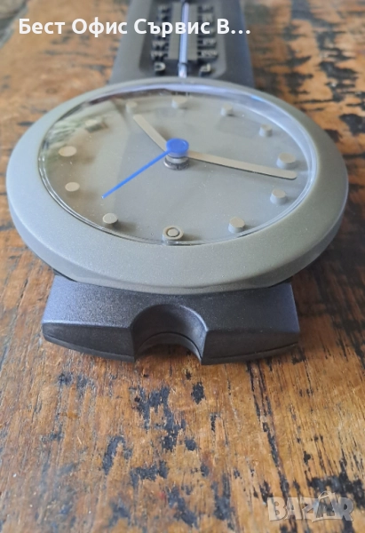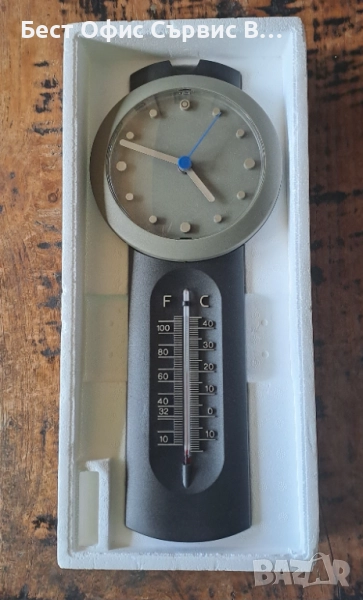 Продавам часовник стенен с термометър Хенкелс Henkels сив Aachen Design Germany. Произведен в Германия. Работи с 1 брой AA/LR6 1.5 V батерия (не е включена). Размер на стенния часовник: 36 см дължина, външен диаметър 15 см, а диаметър на циферблата 12 см. Термометърът показва градуси в Целзий (C) и Фаренхайт (F). На задната страна на часовника има дупка, на която можете да го закачите на стената. В оригиналната кутия, която не е в перфектно състояние, и с размери 44.4x18.5x5.8 см. Уникален. Много рядък. От частна колекция. За ценители.