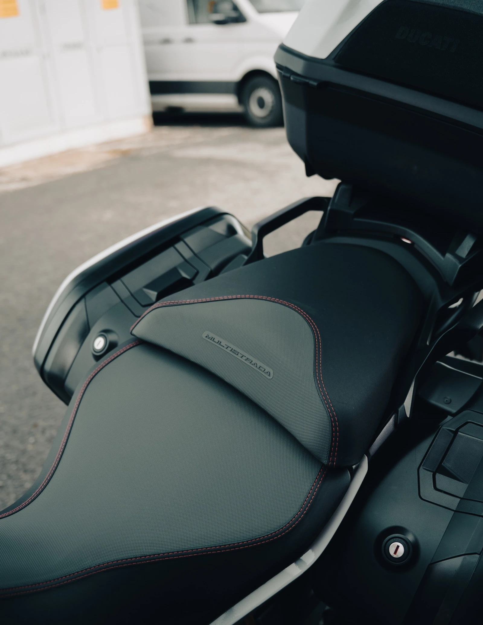 Работен обем на двигателя: 1262 куб. см. Мощност: 156 к. с. при 9500 об. /мин. Въртящ момент: 130 Nm при 7500 об. /мин. Пробег: 58 683 км. Скоростна кутия: 6 степенна с Ducati Quick Shift Up/Down Междуосие: 1529 мм. Височина на седалката: 825-845 мм. Резервоар: 20 литра Закупен от Ducati София. С пълна сервизна история от Ducati, два ключа, keyless и всички екстри за модела. Монтирано Termignoni Titanium exhaust крайно гърне, дава се и оригиналното, спортна слюда Puig и в момента монтирана туристическа, странични ролбари , пълен пакет гардове. Подменени запалителни свещи, масло , въздушен филтър, верига и пиньони. С всички екстри за модела: - Електронно управление на дроселовата клапа (RIDE by WIRE) с 4 различни настройки: 2 за мощността на двигателя и 2 за реакцията на газта. - Електронно регулируемо окачване (Skyhook Suspension), което позволява настройка според настилката, спирачното усилие и ускорението на мотоциклета в реално време; възможност за настройка на твърдостта на возия по вкус (от много комфортна до силно стегната и спортна) - Най-мощната (330-милиметрови дискове, 4-бутални апарати тип моноблок Brembo М50) серийно инсталирана в туристически мотоциклет спирачна система - Анти-блокираща система със сензор за наклон на мотоциклета (Bosch Cornering ABS) - Тракшън контрол с 8 режима на работа (DTC) - Четири режима на управление (Touring, Sport, Urban и Enduro) със специални настройки на двигателя и окачването - Система за подпомагане потегляне от място - мотоциклетът не тръгва назад при наклон (Vehicle Hold Control) - Завиващи фарове, следящи завоя (Ducati Cornering Lights) - Ducati Quick Shift up/down Evo (DQS) - възможност за превключване на предавките нагоре и надолу без съединител - Автоматични мигачи - Автопилот (Cruise Control) - Безключово палене (Hands-Free Ignition) - Подсветка на бутоните на ръкохватките, 5-инчов цветен дисплей, full-LED фарове - Датчици за следене налягането на гумите (TPMS) - Два странични куфара (оригинални) - Протектор за двигателя - Протектор за водния и масления радиатор - Туристическа слюда - Багажен куфар + скара - Навигация Tom Tom