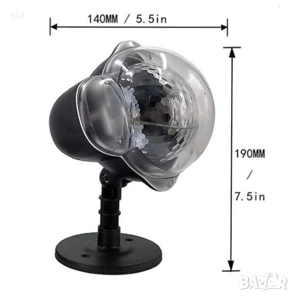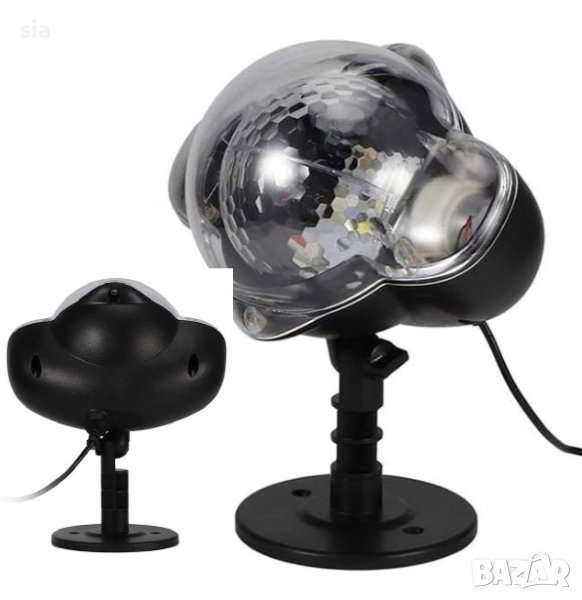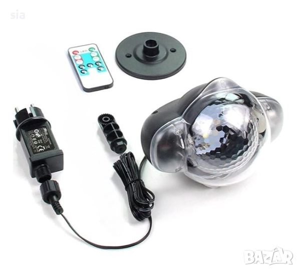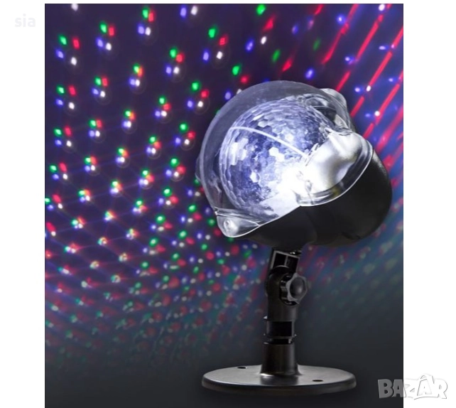 Прожектор 230 V 50 Hz с лазер и светлинни ефекти с въртящи се цветни точки. Светлината е в червено, зелено, синьо и бяло, а размерът на изображението се променя в зависимост от разстоянието на прожектора. Комплектът включва прожектора, кръглата стойка, колче и трансформатор.