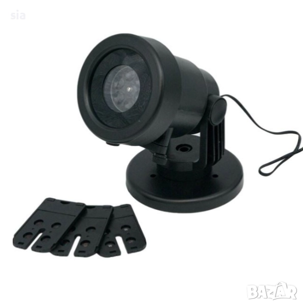 Проектор 220-240 V 50-60 Hz, лазерен светлинен ритъм и 4 карти с въртящи се модели. Цветът на светлината е бял, син и зелен, а размерът на изображението се променя в зависимост от разстоянието до проектора. На най-близко разстояние (1,5 м) размерът на изо