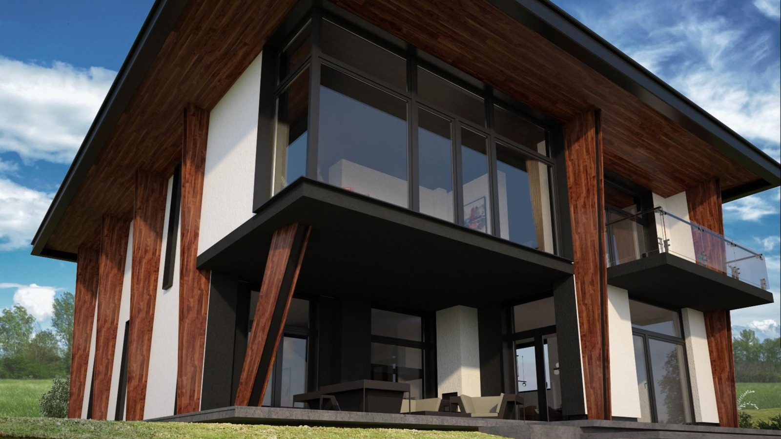 Къща 2 е модерна двуетажна резиденция с впечатляваща визия и хармонична композиция между дърво, стъкло и светли фасадни повърхности. Архитектурният облик се отличава с елегантен наклонен покрив и изчистени линии, които придават динамика и престижно присъствие.