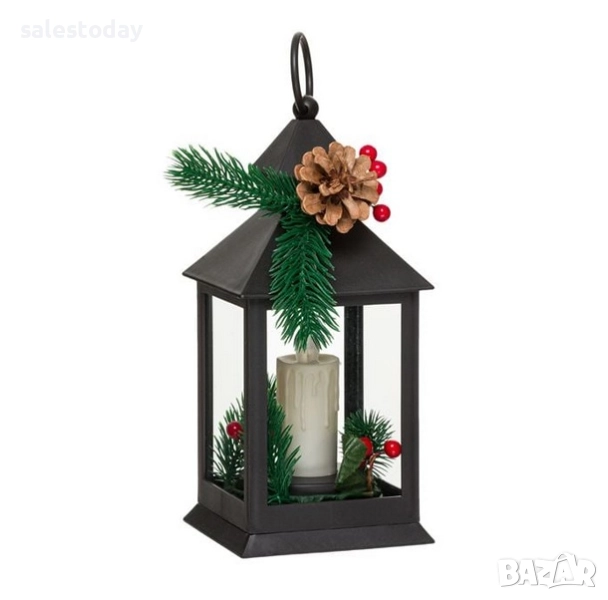 Коледен декоративен фенер, пластмасов, черен, с LED свещ и ела клонка вътре, ела клонка и шишарка отвън. Има бутон за включване/изключване и пластмасов пръстен. Работи с 3 батерии AAA (не са включени).