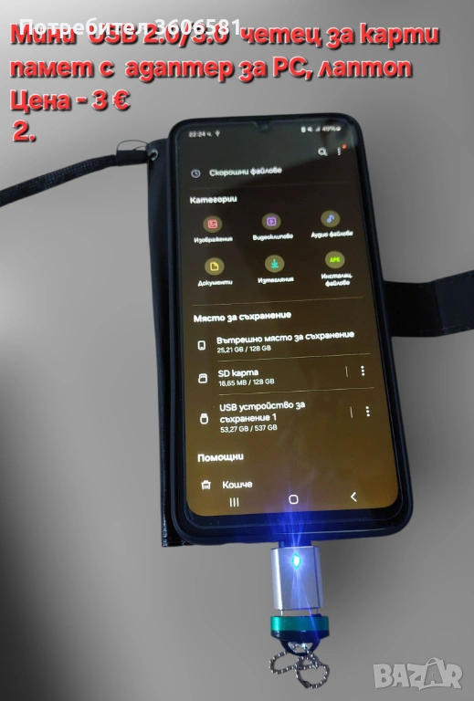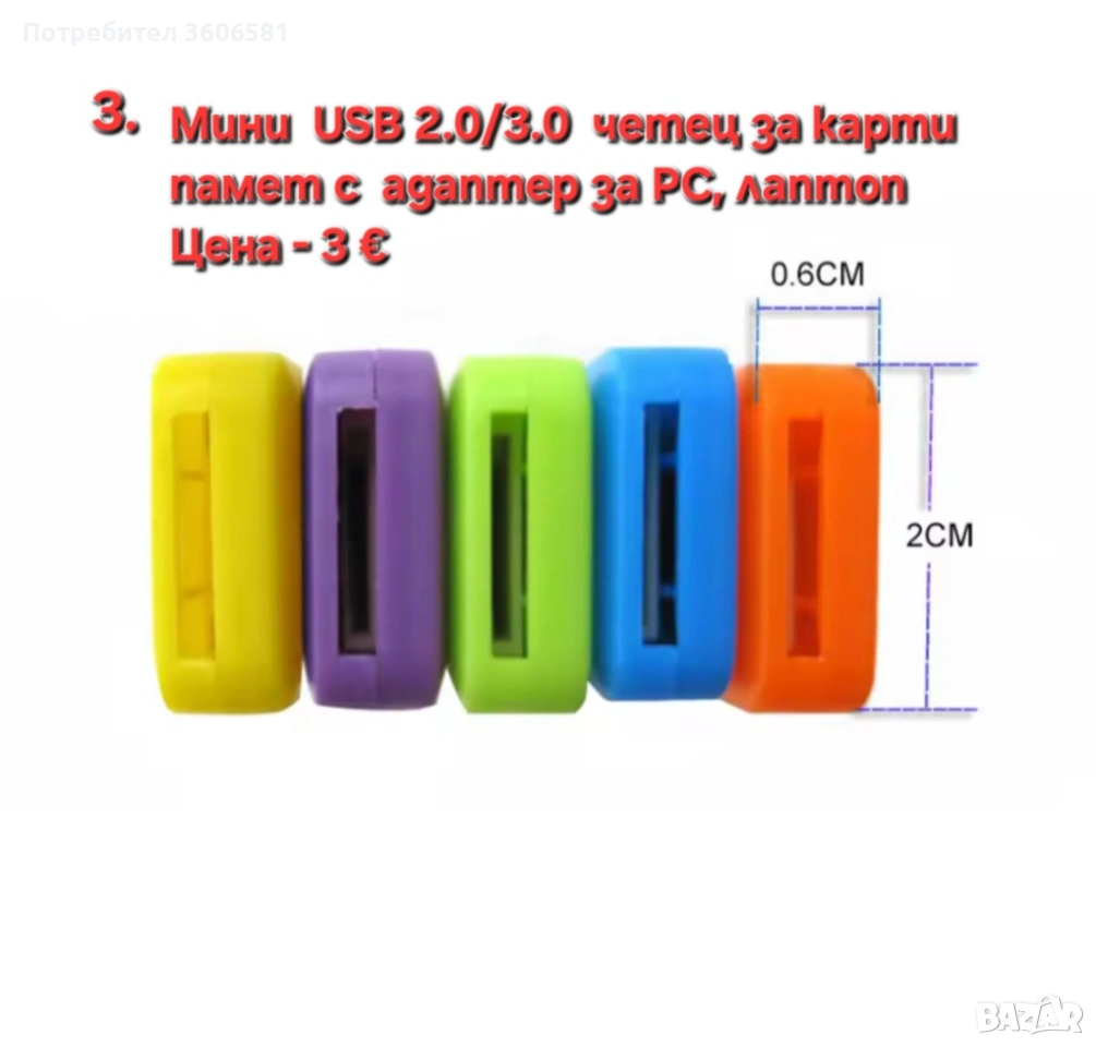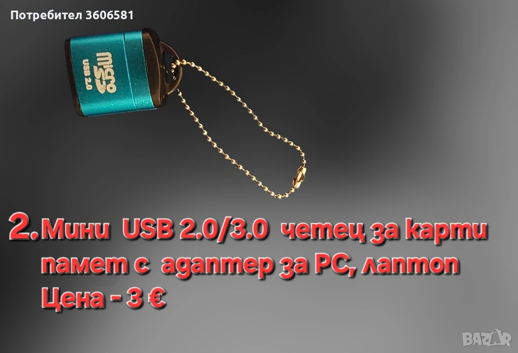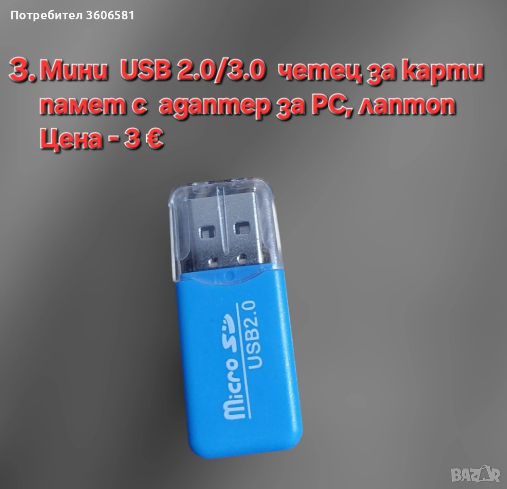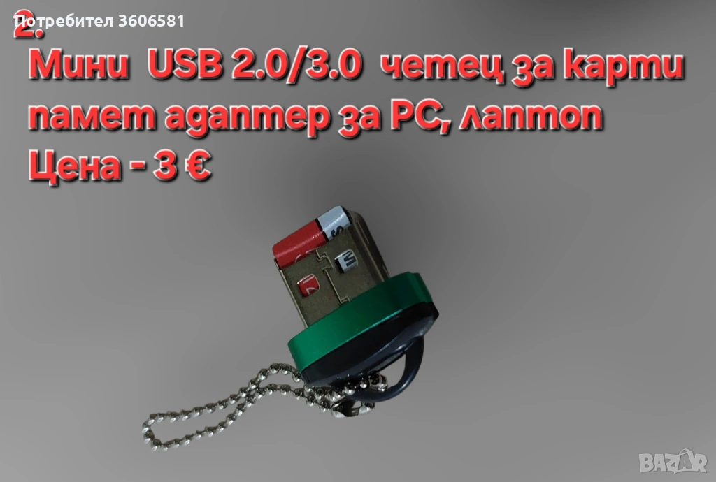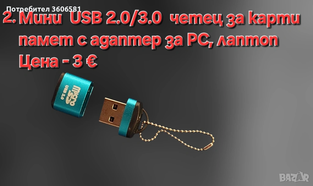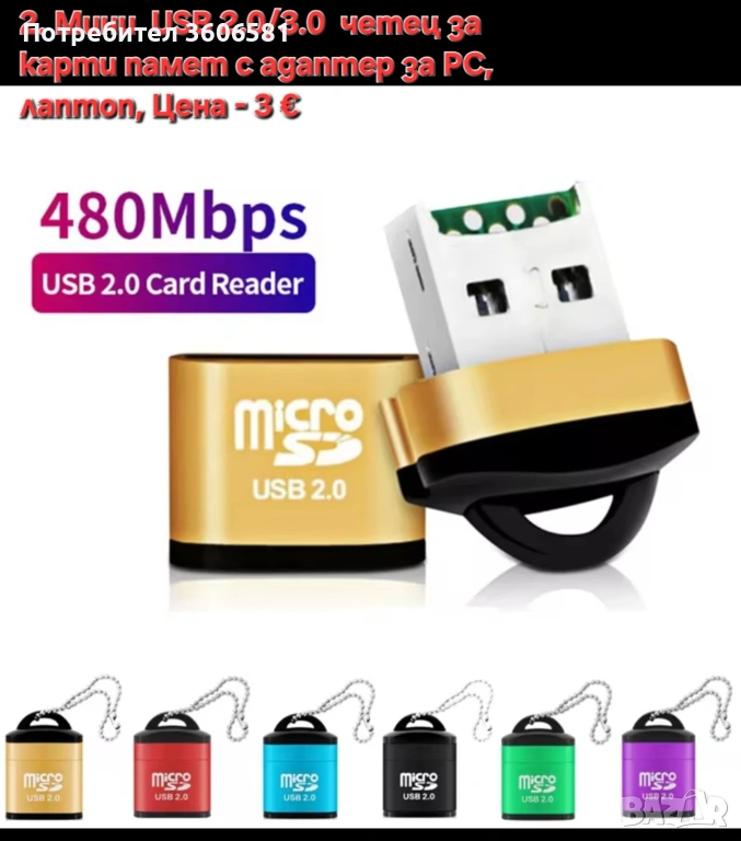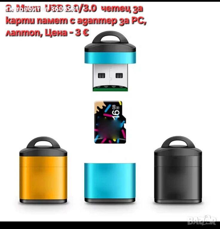 2. Мини преносим USB 2.0/3.0 четец за карти памет със адаптер за PC, лаптоп.